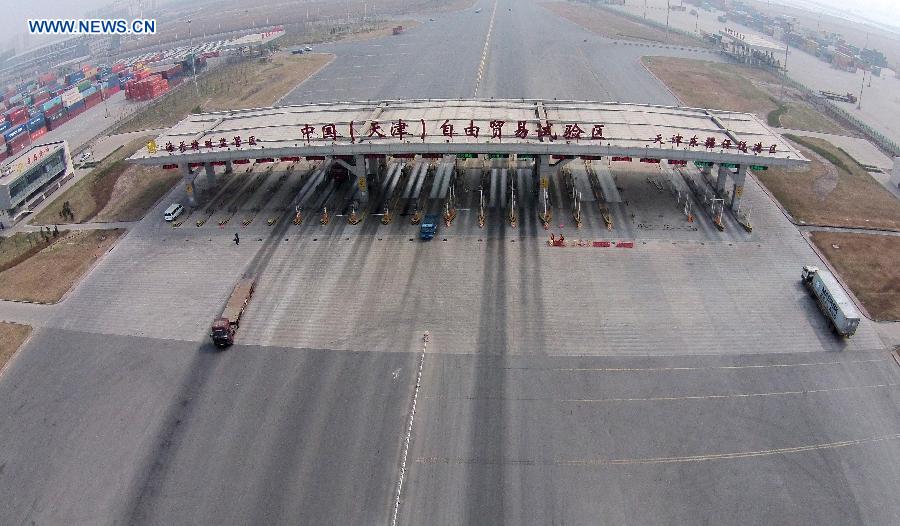 Photo taken on March 30, 2015 shows a gate of the China (Tianjin) Pilot Free Trade Zone in north China's Tianjin Municipality. Three new free trade zones (FTZ) began official operation on April 21, 2015 as China seeks to draw more international commerce. (Xinhua/Yue Yuewei)
