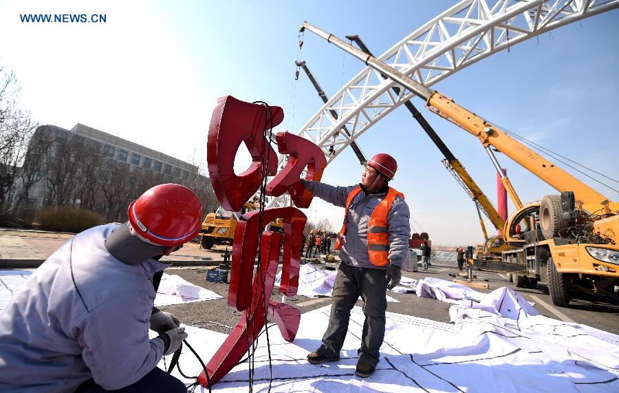 | Engineers install a gate of the China (Tianjin) Pilot Free Trade Zone (FTZ) in north China's Tianjin Municipality, Feb. 10, 2015. Three new free trade zones (FTZ) began official operation on April 21, 2015 as China seeks to draw more international commerce. (Xinhua/Yue Yuewei) |