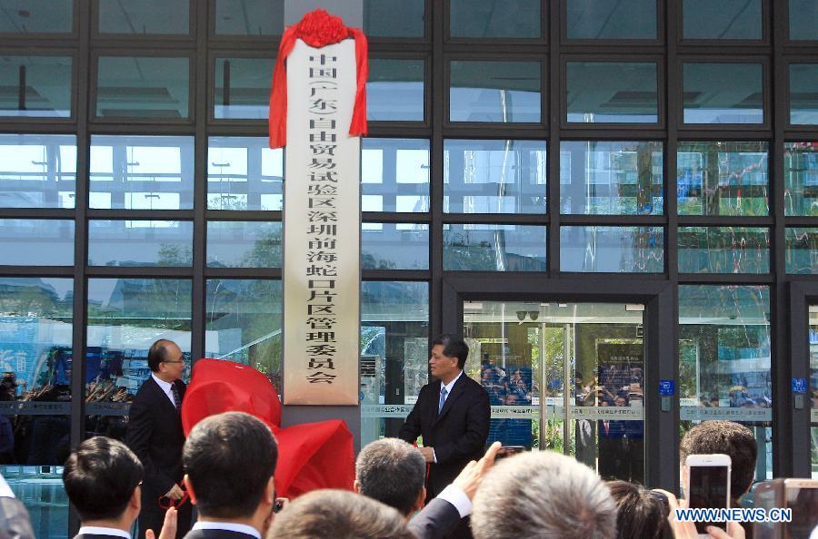 | Ma Xingrui (R), secretary of the Communist Party of China (CPC) Shenzhen Municipal Committee, and Xu Qin, mayor of Shenzhen City, jointly inaugurate China (Guangdong) Pilot Free Trade Zone Qianhai & Shekou Area in Shenzhen, south China's Guangdong Province, April 27, 2015. (Xinhua/Mao Siqian) |