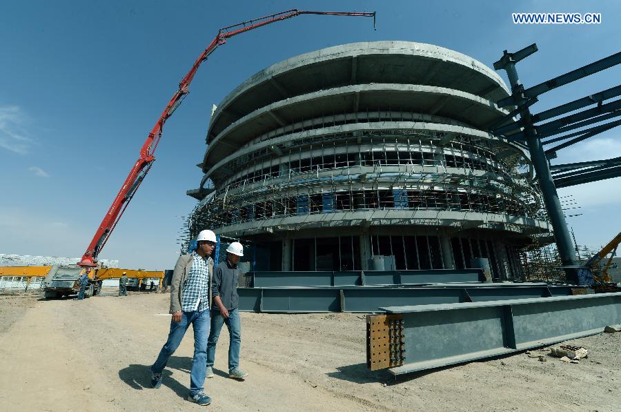 | Laborers work at the construction site of the Lanzhou comprehensive bonded zone in Lanzhou, capital of northwest China's Gansu Province, May 8, 2015. The project is expected to be completed by the end of June. (Xinhua/Fan Peishen) |