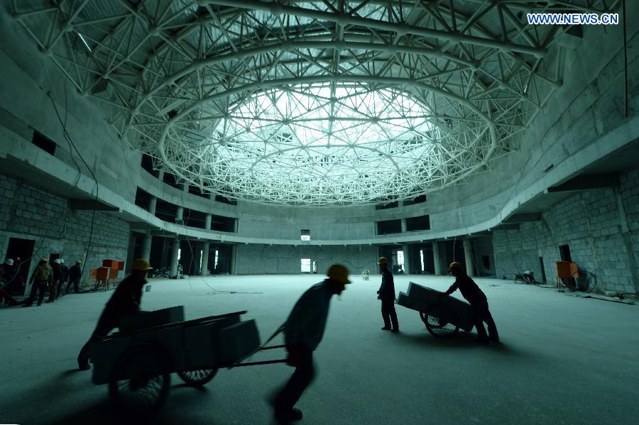 Laborers work at the construction site of the Lanzhou comprehensive bonded zone in Lanzhou, capital of northwest China's Gansu Province, May 8, 2015. The project is expected to be completed by the end of June. (Xinhua/Fan Peishen)