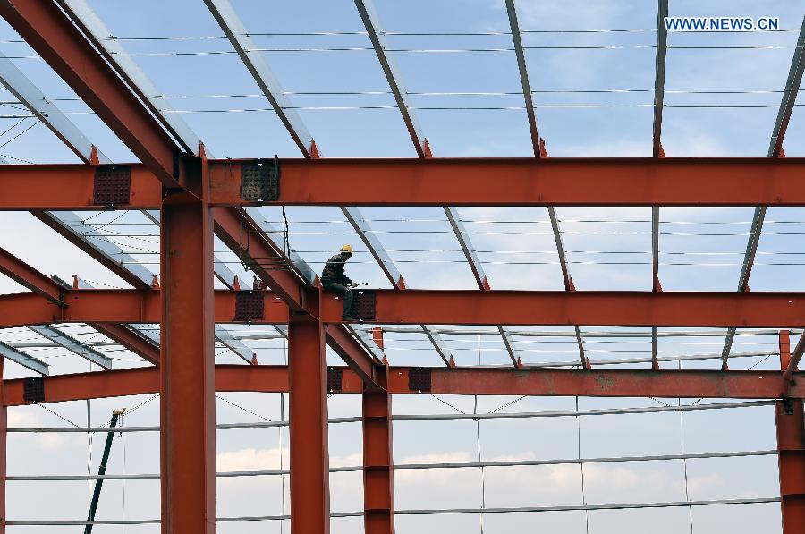 A laborer works at the construction site of the Lanzhou comprehensive bonded zone in Lanzhou, capital of northwest China's Gansu Province, May 8, 2015. The project is expected to be completed by the end of June. (Xinhua/Fan Peishen)