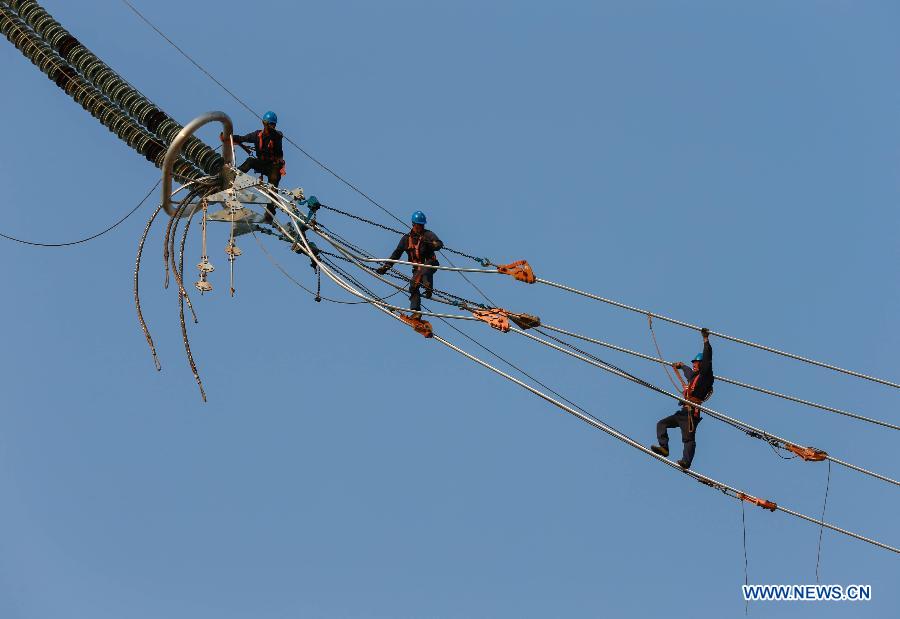 Workers work on 1,000-kilovolt power transmission project about a hundred meters above the ground in Wangdian Township of Huai'an City, east China's Jiangsu Province, May 30, 2015. (Xinhua/Zhou Haijun)