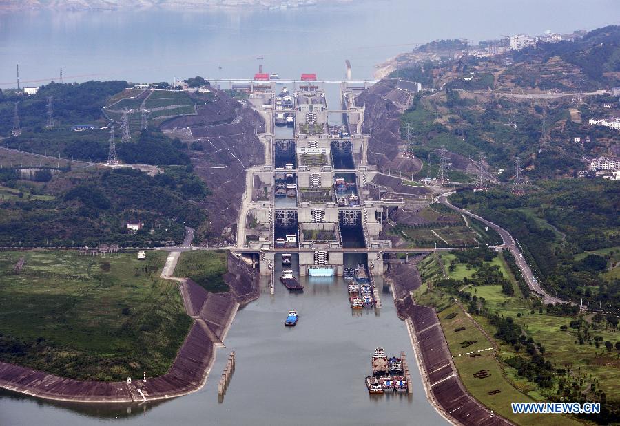 Ships pass the navigation lock of the Three Gorges in Yichang, central China's Hubei Province, May 30, 2015. The freight getting through the navigation lock of the Three Gorges has topped 34.28 million tons from January to April this year, up 5.77 percent compared with that of last year. (Xinhua/Wang Jiaman)