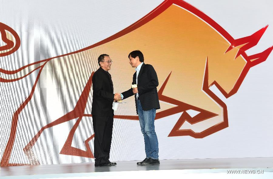 Liu Chuanzhi (L), founder and chairman of Legend Holdings, shakes hands with Lei Jun, CEO of Chinese smartphone maker Xiaomi, during a business event with the theme of "Builders and Movers" held by Legend Holdings in Beijing, capital of China, July 7, 2015. Legend Holdings, the parent company of the world's largest PC maker Lenovo, had its stock listed on Hong Kong Stock Exchange on June 29, 2015. (Xinhua/Jin Liangkuai)