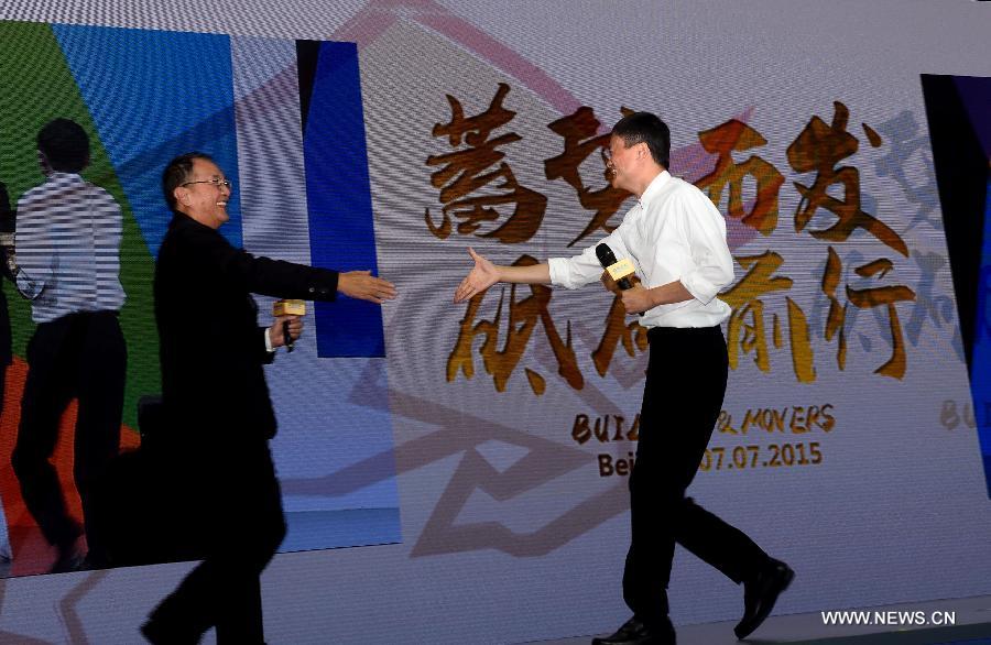 Liu Chuanzhi (L), founder and chairman of Legend Holdings, shakes hands with Ma Yun, founder and chairman of China's e-commerce giant Alibaba, during a business event with the theme of "Builders and Movers" held by Legend Holdings in Beijing, capital of China, July 7, 2015. Legend Holdings, the parent company of the world's largest PC maker Lenovo, had its stock listed on Hong Kong Stock Exchange on June 29, 2015. (Xinhua/Jin Liangkuai)