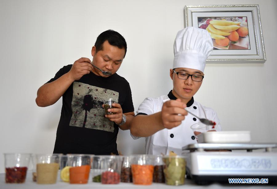 Maker Zhou Jianquan (L) develops seasoning to cook crayfish in Hongze County of Huai'an, east China's Jiangsu Province, July 11, 2015. The 39-year-old Zhou Jianquan opened his online crayfish store in 2015. His "wechat, ecommerce and express delivery" business mode is welcomed by a large amount of customers. (Xinhua/Zhou Hongming)