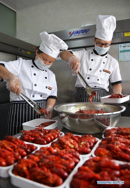Workers of maker Zhou Jianquan's online store pack newly-cooked crayfishes in Hongze County of Huai'an, east China's Jiangsu Province, July 11, 2015. The 39-year-old Zhou Jianquan opened his online crayfish store in 2015. His "wechat, ecommerce and express delivery" business mode is welcomed by a large amount of customers. (Xinhua/Zhou Hongming)