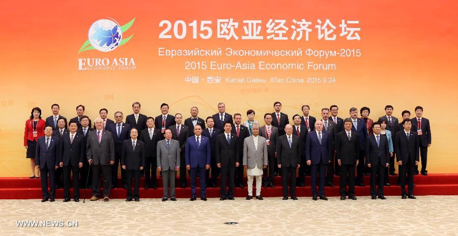 Politicians attending the 2015 Euro-Asia Economic Forum pose for a group picture in Xi'an, capital of northwest China's Shaanxi Province, Sept. 24, 2015. The 2015 Euro-Asia Economic Forum kicked off here Thursday. Over 2,000 politicians, entrepreneurs, scholars, experts and celebrities from 53 countries and regions will take part in the forum. (Xinhua/Liu Xiao)