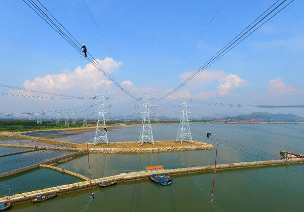 Workers examine an electric power transmission line of a nuclear power plant in east China's Shandong Province, Aug. 29, 2015. The 675-kilometer transmission line, a part of the 500-KV power supply project of the Haiyang Nuclear Power Plant, has 12 kilometers crossing sea water. [Photo: Xinhua]