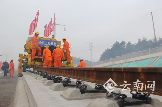 Construction workers begin laying track on Friday in the southwestern province of Yunnan for a high-speed rail link connecting the provincial capital Kunming to Shanghai.(Photo/Yunnan.cn)