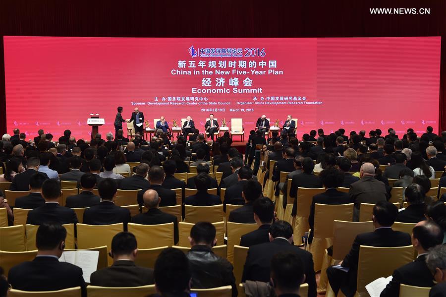 Guests attend the Economic Summit of China Development Forum 2016 in Beijing, capital of China, March 19, 2016. The three-day China Development Forum 2016 kicked off here Saturday. (Xinhua/Li Xin)