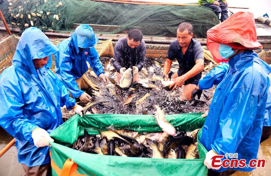 Autumn fishing begins at a fish farm in Chihu Lake in Jiujiang County, East China’s Jiangxi Province, Aug. 15, 2017. The well-protected lake, which covers an area of approximately 400 hectares, is known as a key source of high-quality fish that often sell across the country. Tens of trucks have assembled near the lake to transport the fish out. (Photo: China News Service/Yang Fengsheng)