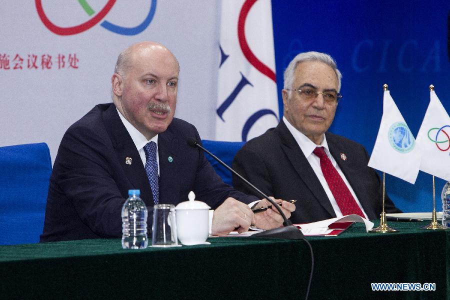 Shanghai Cooperation Organization (SCO) Secretary-General Dmitry Fedorovich Mezentsev (L) and Ambassador Cinar Aldemir, executive director of Secretariat of the Conference on Interaction and Confidence Building Measures in Asia (CICA), response to reporters after signing a memorandum of understanding during a signing ceremony in Shanghai, east China, May 20, 2014. (Xinhua/Lyu Xun)