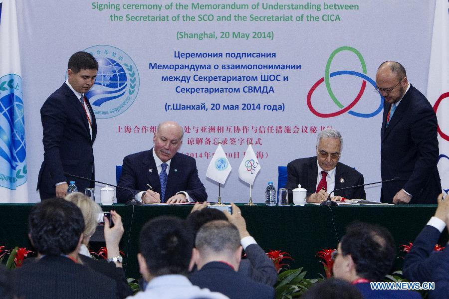 Shanghai Cooperation Organization (SCO) Secretary-General Dmitry Fedorovich Mezentsev (2nd L) and Ambassador Cinar Aldemir (2nd R), executive director of Secretariat of the Conference on Interaction and Confidence Building Measures in Asia (CICA), sign a memorandum of understanding in Shanghai, east China, May 20, 2014. (Xinhua/Lyu Xun)
