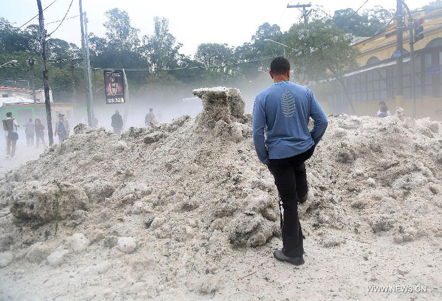 A man stands in a street full of hail in Sao Paulo, Brazil, on May 19, 2014. A severe hailstorm struck the city of Sao Paulo on Sunday. (Xinhua/Rahel Patrasso)