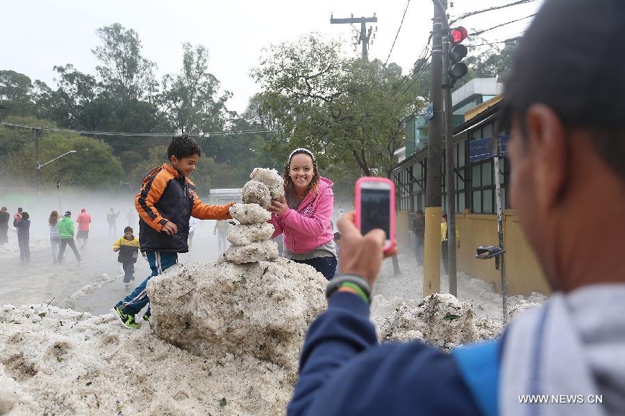 A man takes pictures of kids in a street full of hail in Sao Paulo, Brazil, on May 19, 2014. A severe hailstorm struck the city of Sao Paulo on Sunday. (Xinhua/Rahel Patrasso)
