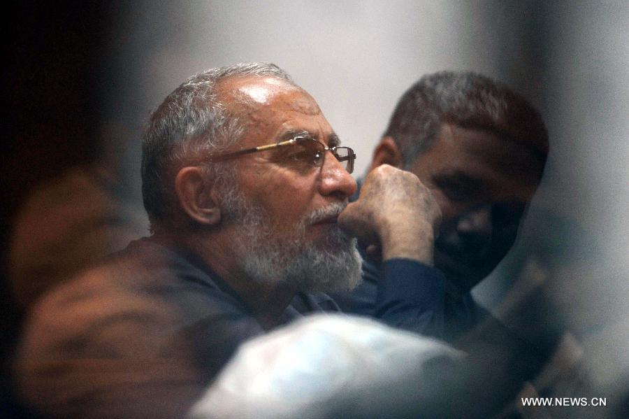 Mohamed Badie, Muslim Brotherhood's leader, is seen in a defendant cage on a court during the trail over his jailbreak in Cairo, capital of Egypt, on May 19, 2014. The trail on Monday over the jailbreak of ousted former president Mohamed Morsi with other 130 members of Muslim Brotherhood including its leader Mohamed Badie was postponed to June 7. (Xinhua/Ahmed Omar)