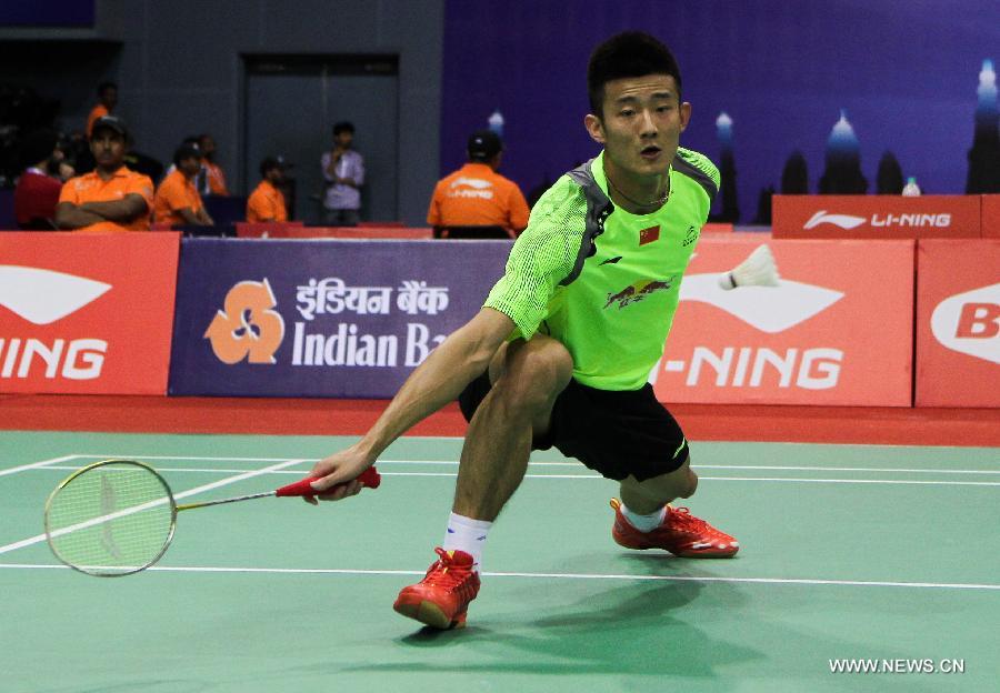 Chen Long of China returns a shot during the Thomas Cup Group D match against Russia's Vladimir Malkov, at the Siri Fort Stadium in New Delhi, India, May 19, 2014. Chen Long won 2-0. (Xinhua/Zheng Huansong)