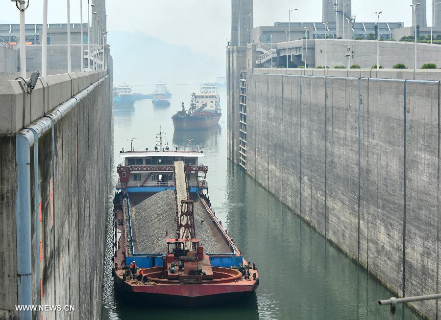 A vessel passes the five-level ship lock of the Three Gorges in Yichang, central China's Hubei Province, May 19, 2014. The Three Gorges have lowered its water level to meet with the upcoming flood season, which allows vessels to shorten travel time by 40 minutes as they pass the five-level ship lock of the Three Gorges. (Xinhua/Zheng Jiayu)