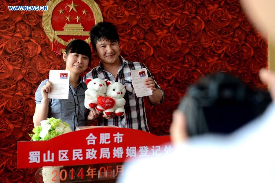 Newlyweds pose for photos after they register for marriage at a marriage registry in Hefei, capital of east China's Anhui Province, May 20, 2014. Many couples chose to register for marriage on May 20 as the sound "520" is homophonic for "I Love You" in Chinese. (Xinhua/Zhang Duan)