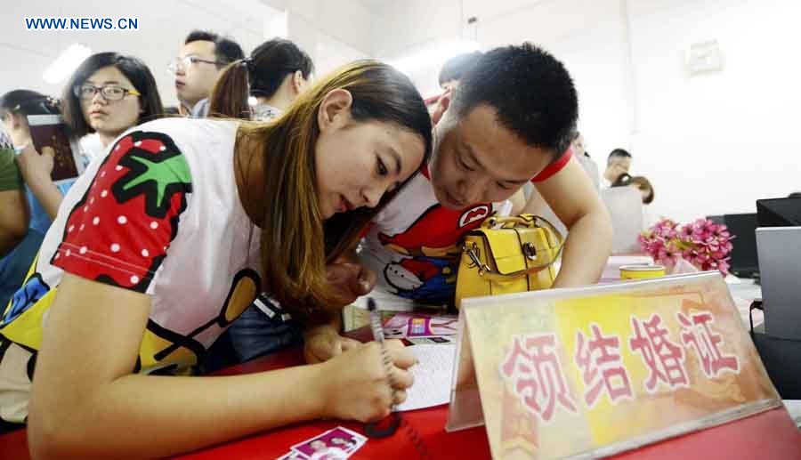 Lovers register for marriage at a marriage registry in Jinan, capital of east China's Shandong Province, May 20, 2014. Many couples chose to register for marriage on May 20 as the sound "520" is homophonic for "I LoveYou" in Chinese. (Xinhua/Zhao Xiaoming)