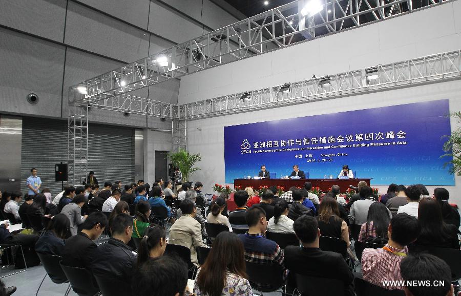 The press briefing of the 4th Summit of the Conference on Interaction and Confidence Building Measures in Asia (CICA) is held in Shanghai, east China, May 19, 2014. The summit will be held in Shanghai from May 20 to 21. (Xinhua/Pei Xin)