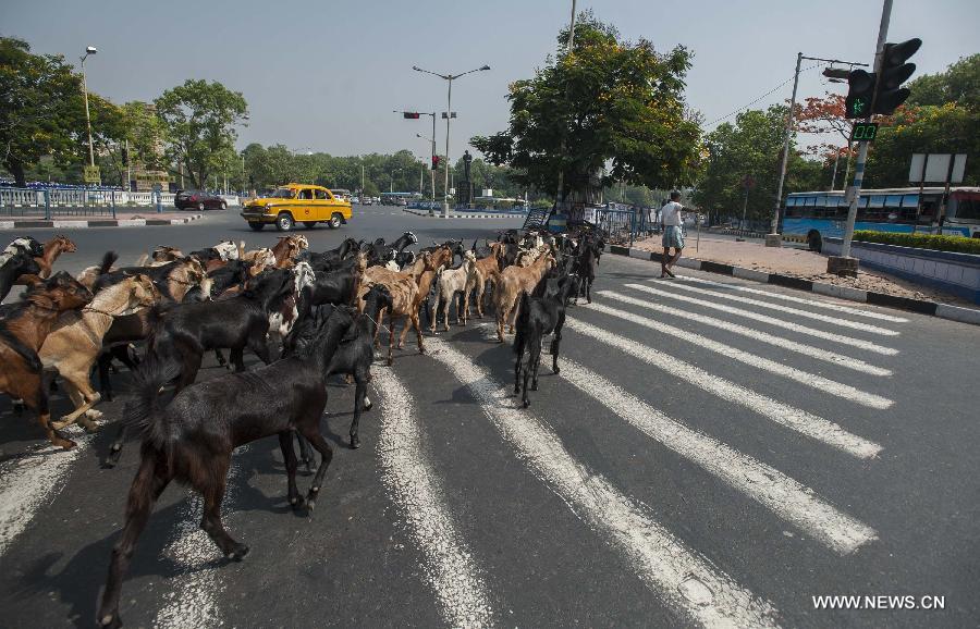 A shepherd herds goats near Maidan ground in Calcutta, capital of eastern Indian state West Bengal, May 20, 2014. (Xinhua/Tumpa Mondal)