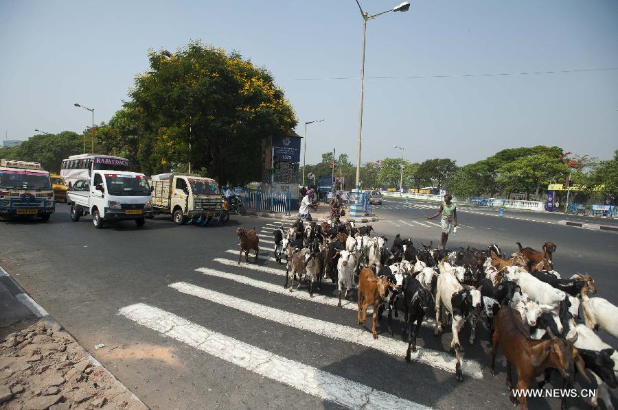 A shepherd herds goats near Maidan ground in Calcutta, capital of eastern Indian state West Bengal, May 20, 2014. (Xinhua/Tumpa Mondal)