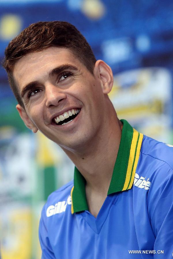 Oscar of the Brazilian national soccer team reacts during a press conference of a promotional event in Sao Paulo, Brazil, on May 20, 2014. (Xinhua/Rahel Patrasso)