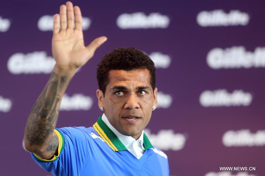 | Dani Alves of the Brazilian national soccer team gestures during a press conference of a promotional event in Sao Paulo, Brazil, on May 20, 2014. (Xinhua/Rahel Patrasso) |