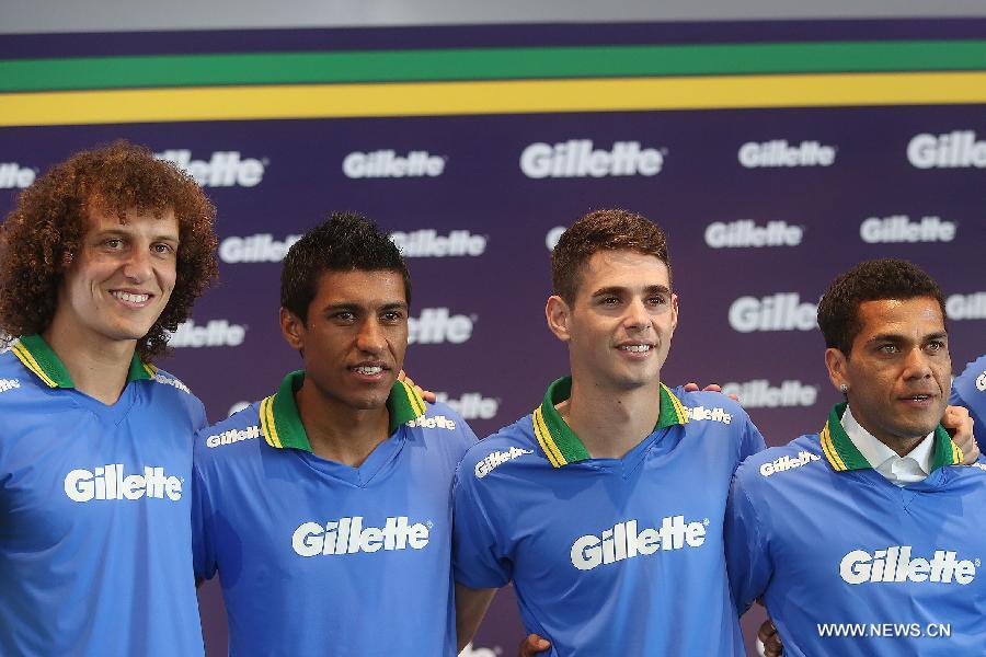 David Luiz, Paulinho, Oscar and Dani Alves (L to R) of the Brazilian national soccer team pose for pictures during a press conference of a promotional event in Sao Paulo, Brazil, on May 20, 2014. (Xinhua/Rahel Patrasso)