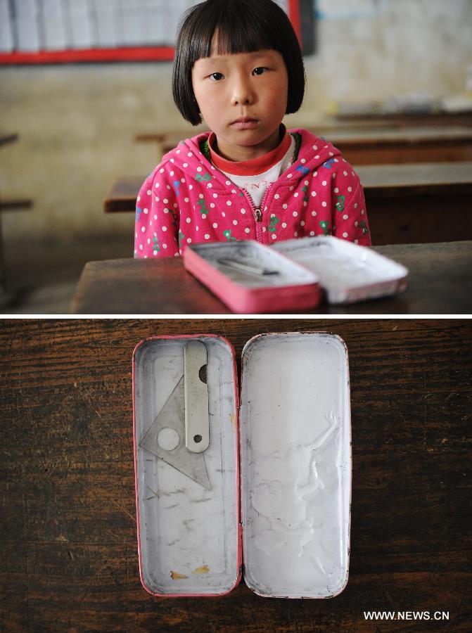 This photo combination shows second-grade student Zhang Yanying (above) and the inside of her pencil box (below) at Baimiao Elementary School in Sanquan Town of Nanchuan District, southwest China's Chongqing Municipality, May 20, 2014. Most of the 45 students enrolled in Baimiao Elementary School are left-behind children from nearby rural areas whose parents make a living as migrant workers in cities. For years, the students here have been faced with insufficient educational supplies, notably stationery. (Xinhua/Li Jian)