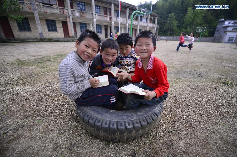 Four students cram in a waste tire as they skim through dictionaries given by public donors at Liyuan Elementary School in Xikeng Village under Wanzai County of Yichun, east China's Jiangxi Province, May 20, 2014. The lack of trained teachers has been a ubiquitous problem that bothers many elementary schools in rural China. Education authorities of Wanzai County have launched a five-year teacher training program in 2014 to address the demand for teachers in the county's rural areas. Each year, the program will receive 30 junior high applicants who are from rural areas. Half of the applicants are required to work in rural schools when they finish the program. (Xinhua/Zhou Mi)