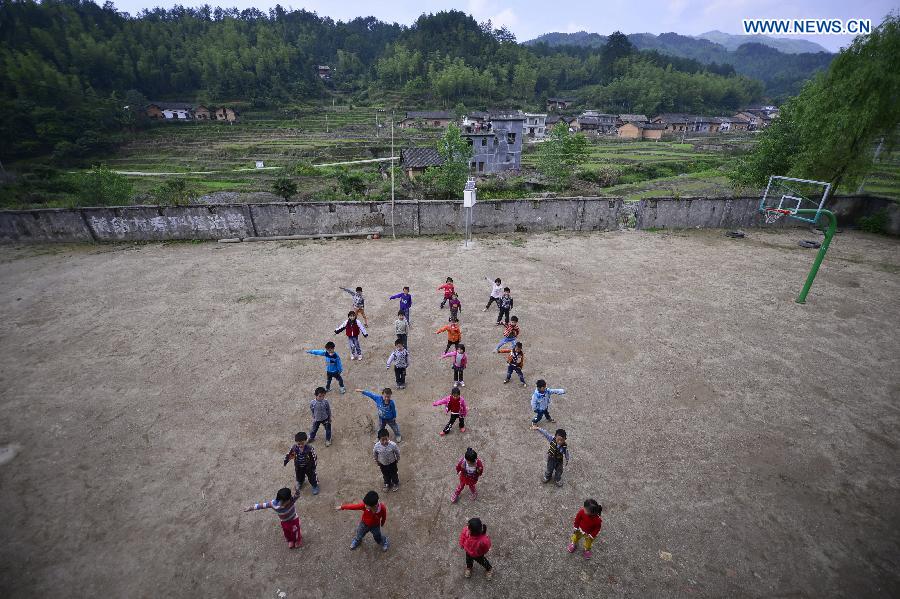 Students do physical exercises on the playground at Liyuan Elementary School in Xikeng Village under Wanzai County of Yichun, east China's Jiangxi Province, May 20, 2014. The lack of trained teachers has been a ubiquitous problem that bothers many elementary schools in rural China. Education authorities of Wanzai County have launched a five-year teacher training program in 2014 to address the demand for teachers in the county's rural areas. Each year, the program will receive 30 junior high applicants who are from rural areas. Half of the applicants are required to work in rural schools when they finish the program. (Xinhua/Zhou Mi)