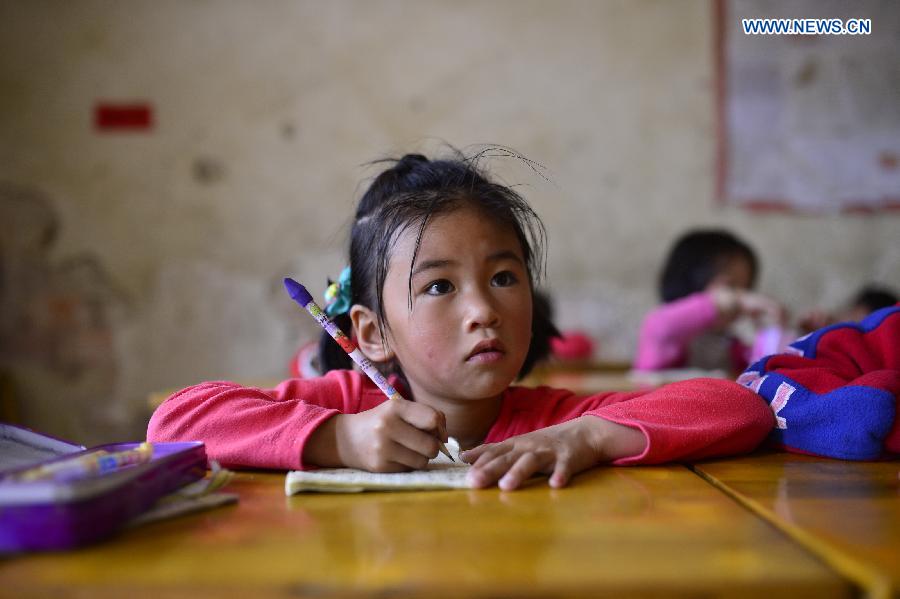 A student listens to a class lecture at Liyuan Elementary School in Xikeng Village under Wanzai County of Yichun, east China's Jiangxi Province, May 20, 2014. The lack of trained teachers has been a ubiquitous problem that bothers many elementary schools in rural China. Education authorities of Wanzai County have launched a five-year teacher training program in 2014 to address the demand for teachers in the county's rural areas. Each year, the program will receive 30 junior high applicants who are from rural areas. Half of the applicants are required to work in rural schools when they finish the program. (Xinhua/Zhou Mi)