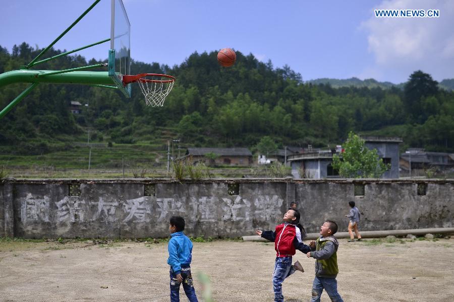 Students play basketball at Liyuan Elementary School in Xikeng Village under Wanzai County of Yichun, east China's Jiangxi Province, May 20, 2014. The lack of trained teachers has been a ubiquitous problem that bothers many elementary schools in rural China. Education authorities of Wanzai County have launched a five-year teacher training program in 2014 to address the demand for teachers in the county's rural areas. Each year, the program will receive 30 junior high applicants who are from rural areas. Half of the applicants are required to work in rural schools when they finish the program. (Xinhua/Zhou Mi)
