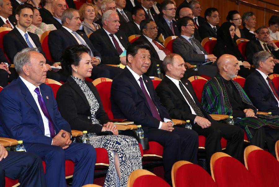 Chinese President Xi Jinping, his wife Peng Liyuan and guests attending the fourth summit of the Conference on Interaction and Confidence Building Measures in Asia (CICA) view performances at the Shanghai Grand Theatre in Shanghai, May 20, 2014. Xi held a welcome banquet for guests attending the 4th CICA summit. (Xinhua/Pang Xinglei)