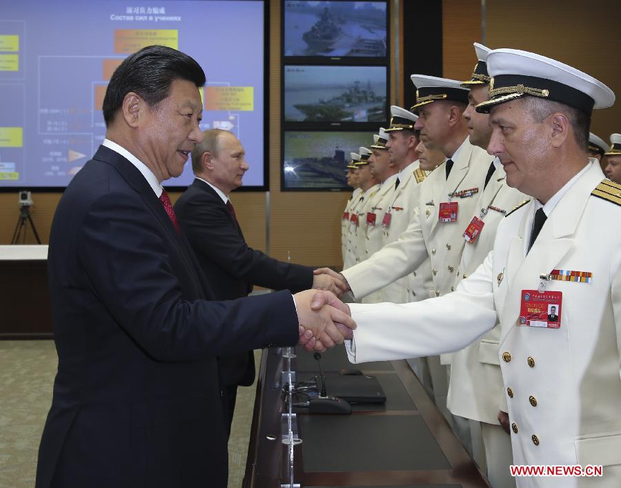 Chinese President Xi Jinping (1st L) and his Russian counterpart Vladimir Putin (2nd L) shake hands with members of the naval forces from both sides before the launch ceremony of the China-Russia "Joint Sea-2014" exercise at Wusong naval port in Shanghai, east China, May 20, 2014. (Xinhua/Lan Hongguang)