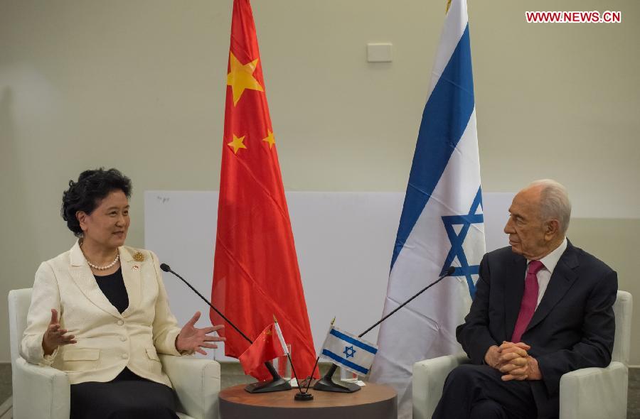 | Chinese Vice Premier Liu Yandong (L) meets with Israeli President Shimon Peres in Tel Aviv, Israel, on May 20, 2014. (Xinhua/Li Rui) |