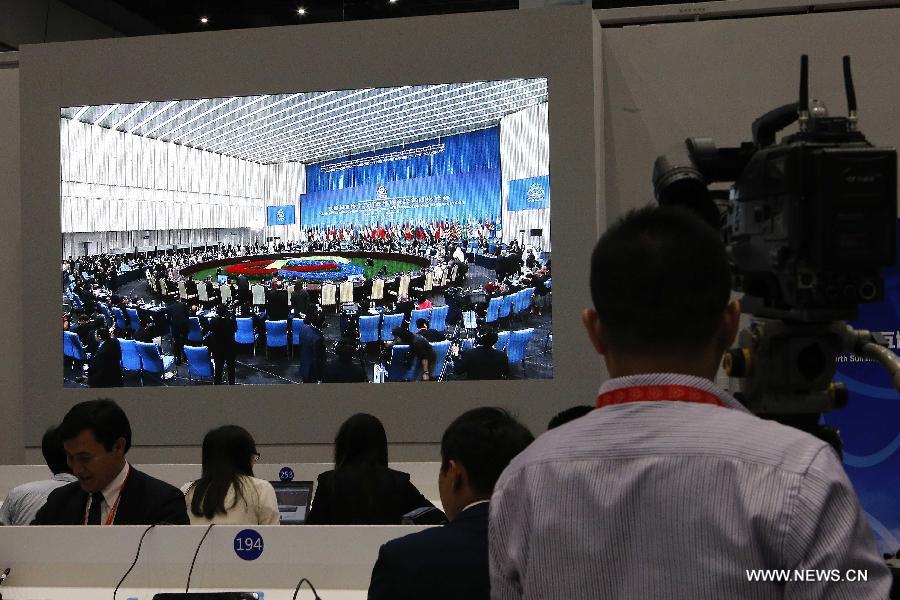 | Journalists work at a media center of the fourth summit of the Conference on Interaction and Confidence Building Measures in Asia (CICA) in east China's Shanghai, May 21, 2014. The fourth CICA summit began in Shanghai on Wednesday morning. (Xinhua/Zhang Yuwei) |