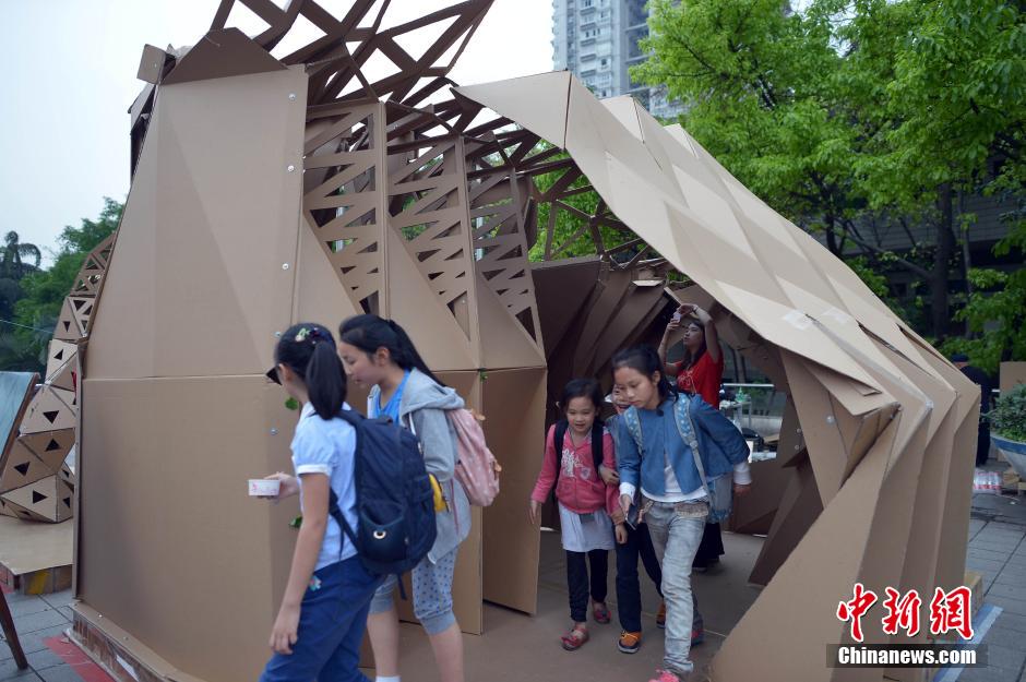 Students of high schools and colleges present their creativity by building cardboard houses on campus of Chongqing University. They built nearly 20 houses with cardboard in several shapes within eight hours. (CNS/ Zhong Xin)
