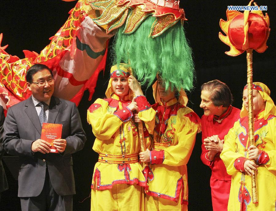 Chinese Consul General in Sydney Li Huaxin (1st, L) and Australian New South Wales Governor Marie Bashir (2nd, R) attend the opening of Ravenswood's Confucius Classroom in the Ravenswood School for Girls in Sydney, Australia, May 21, 2014. (Xinhua/Jin Linpeng)