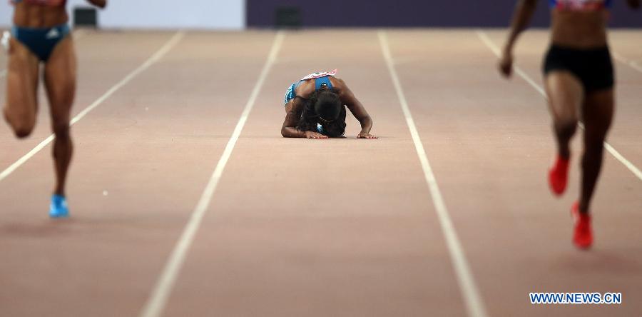 Veronica Campbell-Brown (C) of the United States sprints during the women's 100 meters at the IAAF World Challenge Beijing, China, May 21, 2014. Veronica Campbell-Brown finished the match in 11.14 seconds and claimed the title. (Xinhua/Bai Xuefei)