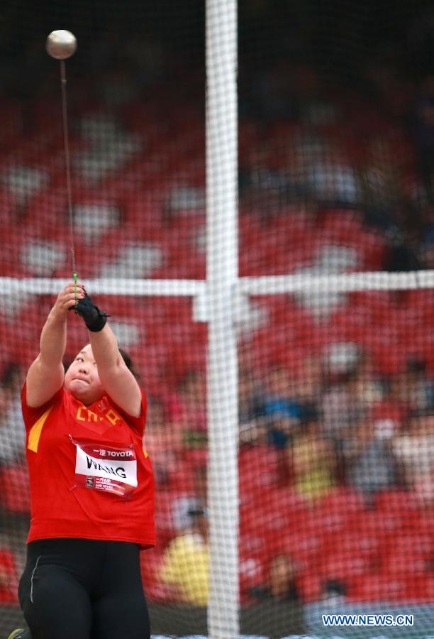 China's Wang Zheng competes during the women's hammer throw at the IAAF World Challenge Beijing, China, May 21, 2014. Wang Zheng took the first place of the event with 75.23m. (Xinhua/Li Ming)
