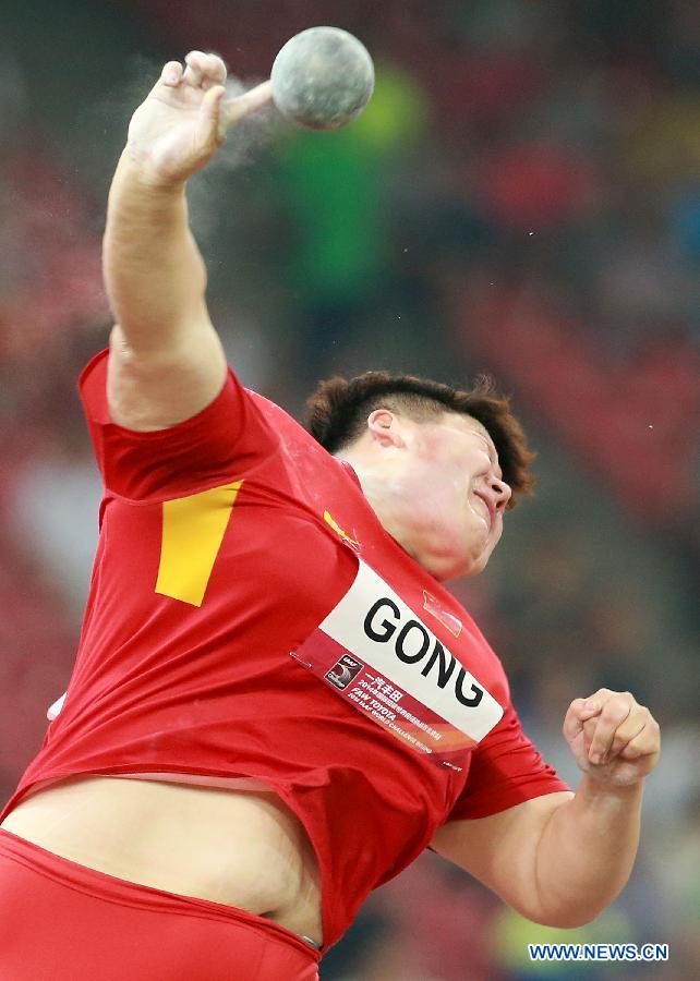 Gong Lijiao of China reacts during the women's shot put at the IAAF World Challenge Beijing, China, May 21, 2014. Gong Lijiao took the second place of the event with 19.61m. (Xinhua/Li Ming)