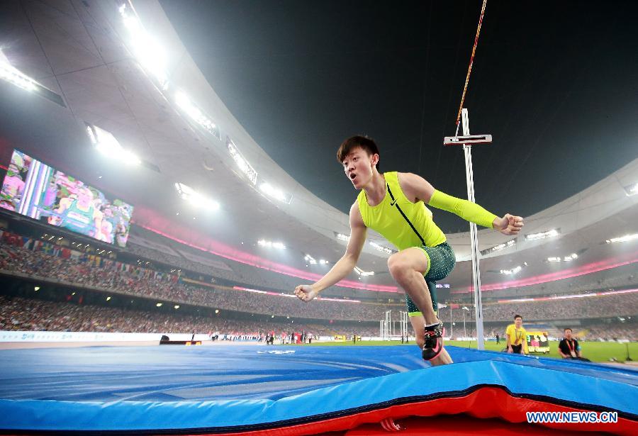Xue Changrui of China celebrates during the men's pole vault at the IAAF World Challenge Beijing, China, May 21, 2014. Xue Changrui claimed the title with 5.80m. (Xinhua/Li Ming)