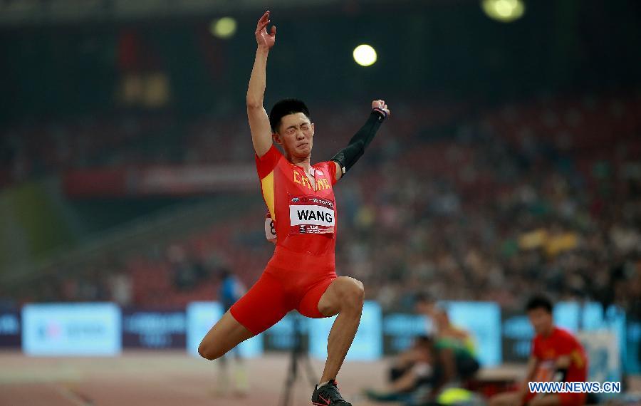 Wang Jianan of China competes during the men's long jump at the IAAF World Challenge Beijing, China, May 21, 2014. Wang Jianan took the first place of the event with 8.09m. (Xinhua/Li Ming)