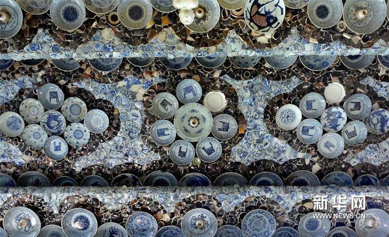 A corridor ceiling decorated with porcelain fragments and bowls at the China House. [Photo/Xinhua]