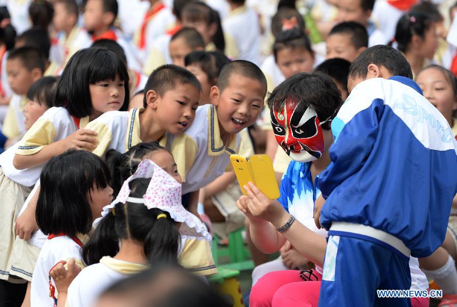 A Peking opera actor wearing opera facial mask pose for photos in front of his cell phone during an event "Peking Opera Comes to Campus" at Haojiaxiang Elementary School in Xi'an, capital of north China's Shaanxi Province, May 22, 2014. (Xinhua/Li Yibo)